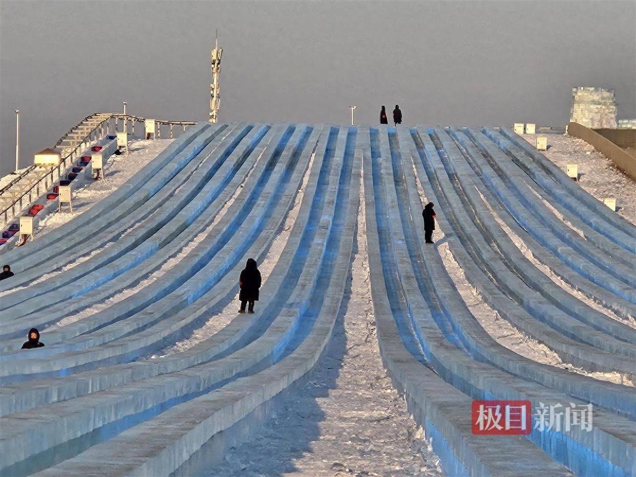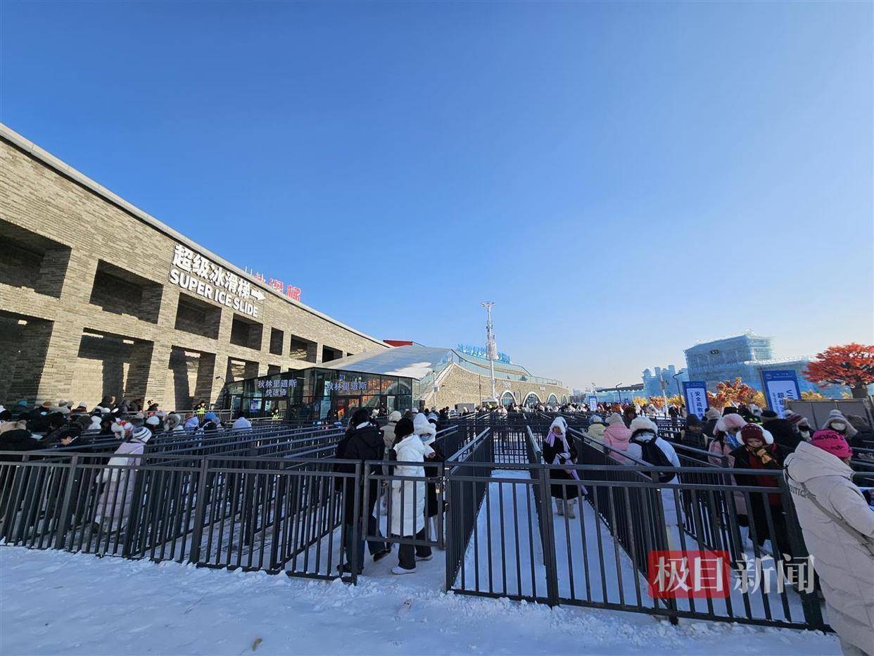 17日下午,极目新闻记者在哈尔滨冰雪大世界景区看到,除了“冰灯启梦”“高铁”“蒸汽火车”诸多冰雕景观,超级冰滑梯景点的滑道由于预约人数太多,入口处被栏杆隔成数个S形的通道,游客通过线上预约后排队等待体验。极目新闻记者看到,现场有近千名游客排起了近百米的长队。